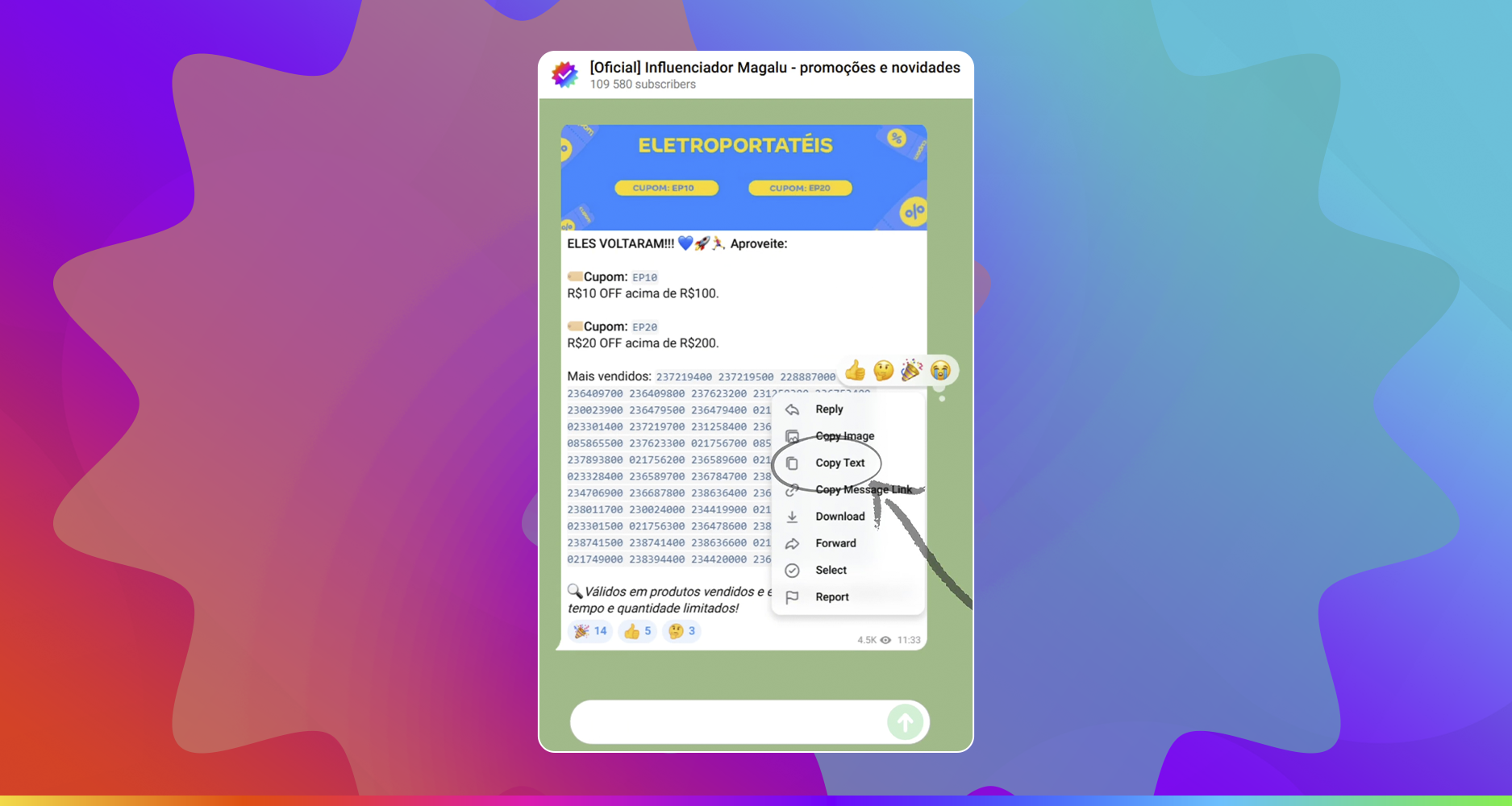 Quando for uma seleção com vários códigos, use o botão “copiar código” do próprio Telegram para transferir todos de uma vez.
