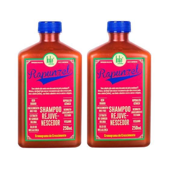 Kit Lola Cosmetics Rapunzel - Shampoo Rejuvenescedor 250 ml - 2 UnidadesShampoo Rejuvenescedor Lola Cosmetics Rapunzel 250 ml um shampoo rejuvenescedor que proporciona uma sensação refrescante no couro cabeludo,estimulando a micro circulação sanguínea.